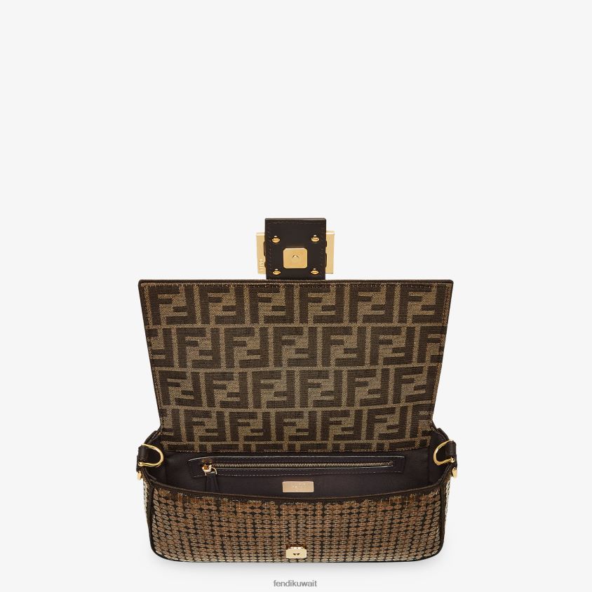 حقيبة باغيت متوسطة الحجم أيقونية مصنوعة من قماش جاكار ff ومطرزة بالكامل بالترتر الشفاف اللامع. مزين بمشبك ff.