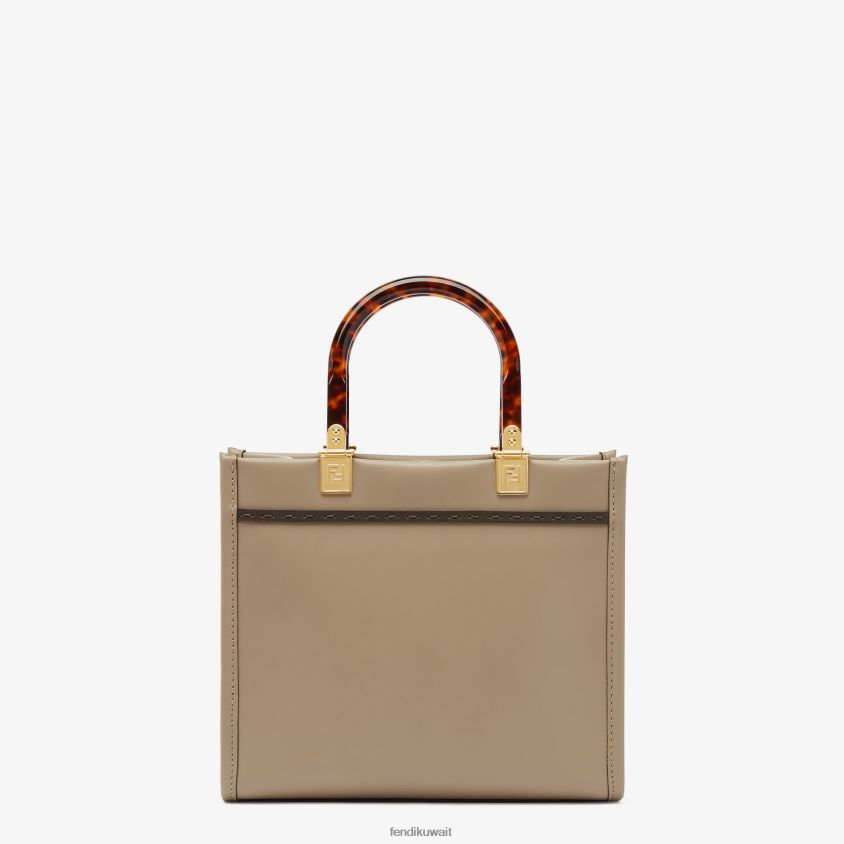 حقيبة تسوق صغيرة Sunshine مصنوعة من الجلد باللون الرمادي الفاتح، ومطرزة بدقة بزخارف نباتية وأحرف فندي روما بخيوط بنية داكنة. مقابض مصنوعة من زجاج شبكي صلب بمظهر صدفة السلحفاة.