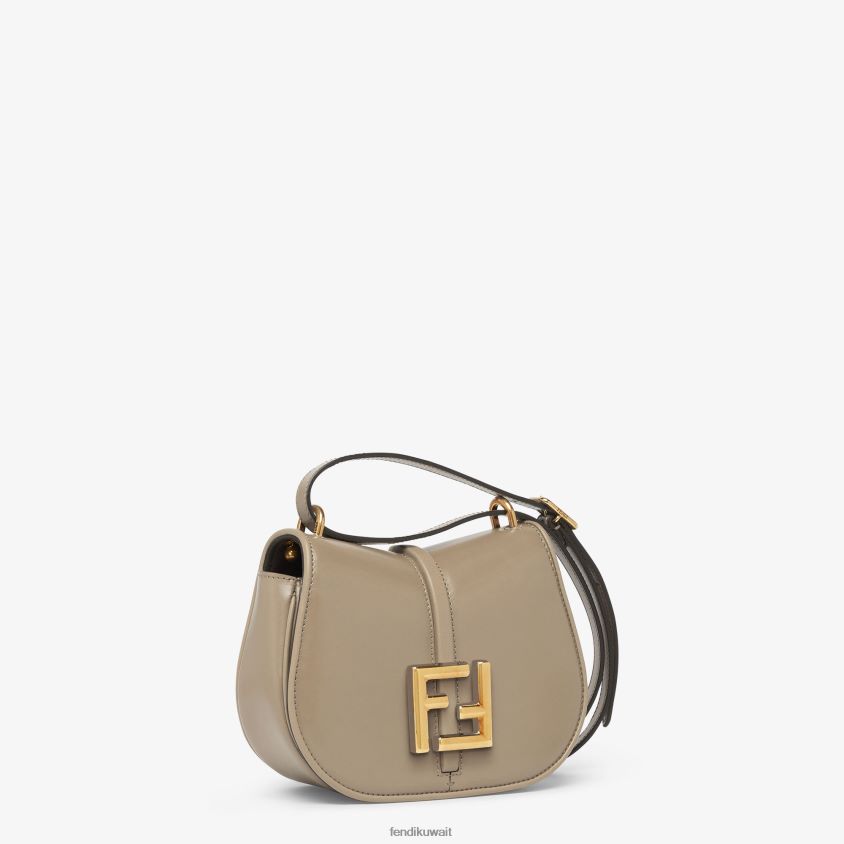 حقيبة صغيرة بخطوط أنثوية منحنية مصنوعة من الجلد باللون الرمادي الداكن. مزينة بتفاصيل وحواف منقوشة وشعار ff على الغطاء.