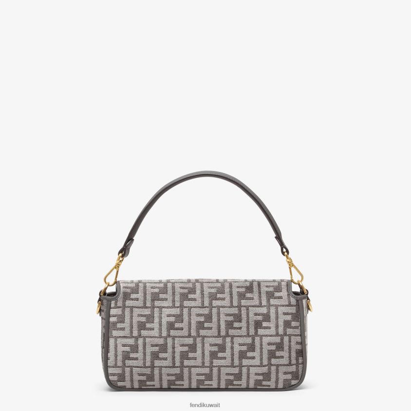 حقيبة باغيت متوسطة الحجم أيقونية مصنوعة من قماش الشانيل ومزخرفة بنقش ff باللون الرمادي الداكن. تم تشطيبها بتفاصيل من الجلد بلون واحد ومزينة بمشبك على شكل حرف ff.
