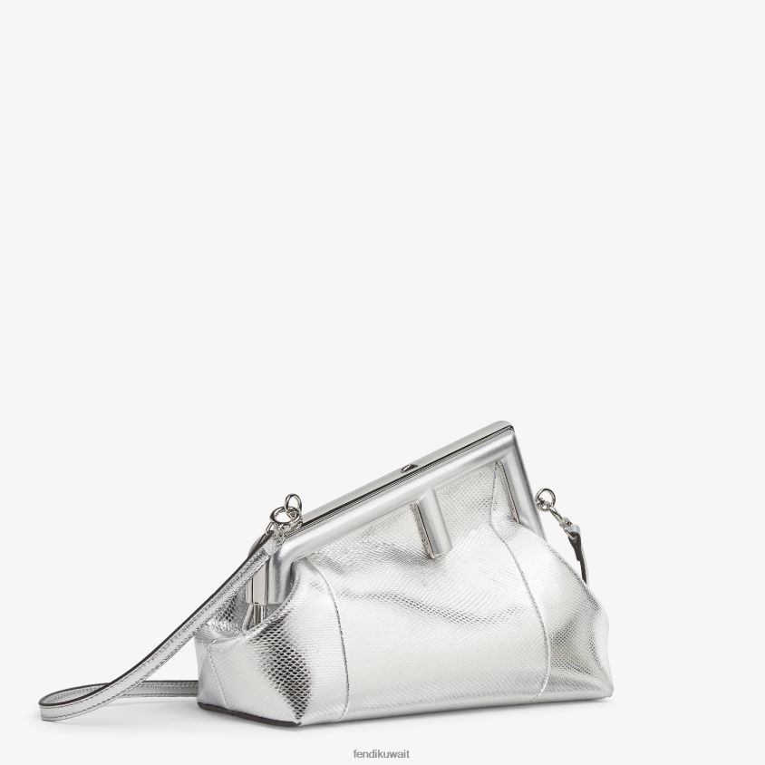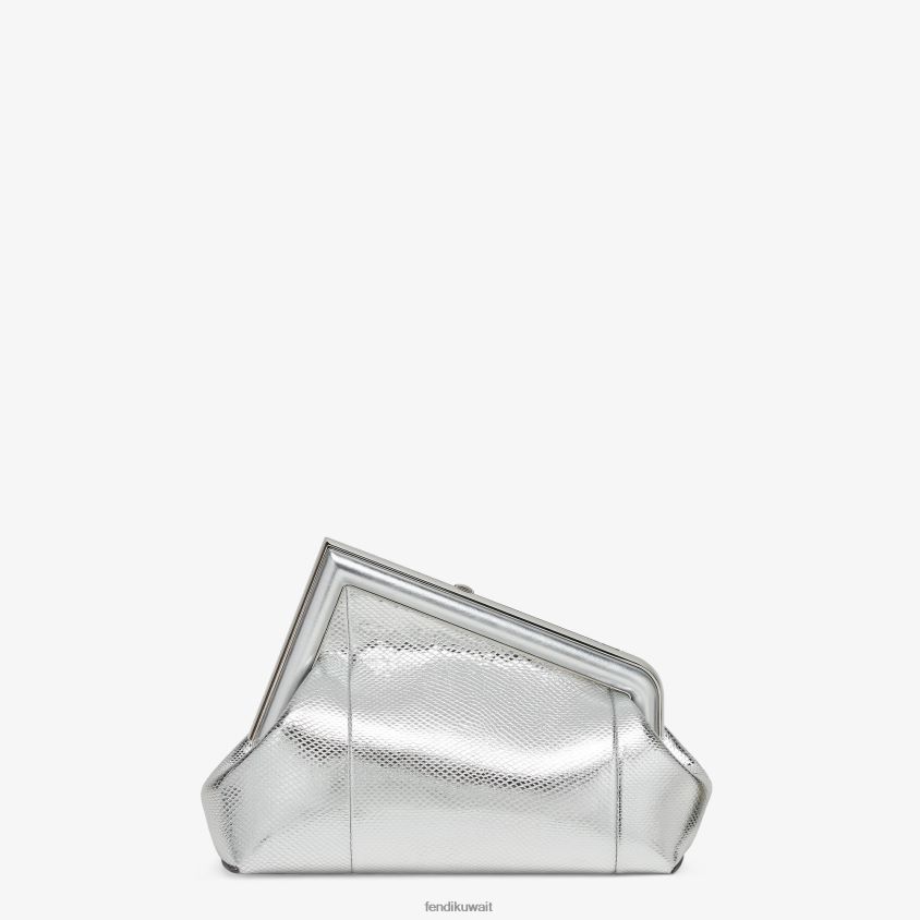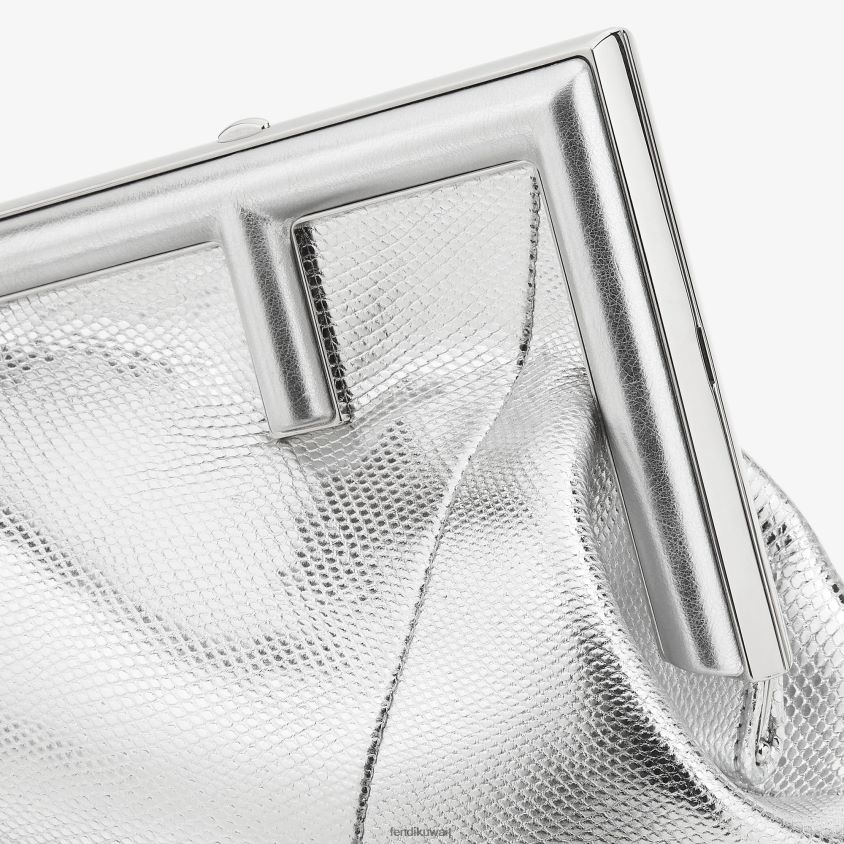 أول حقيبة صغيرة من فندي مصنوعة من جلد الكارونغ الفضي الرائع ذو المظهر المعدني مع مشبك معدني كبير الحجم على شكل حرف F مربوط بجلد البايثون المتناغم.