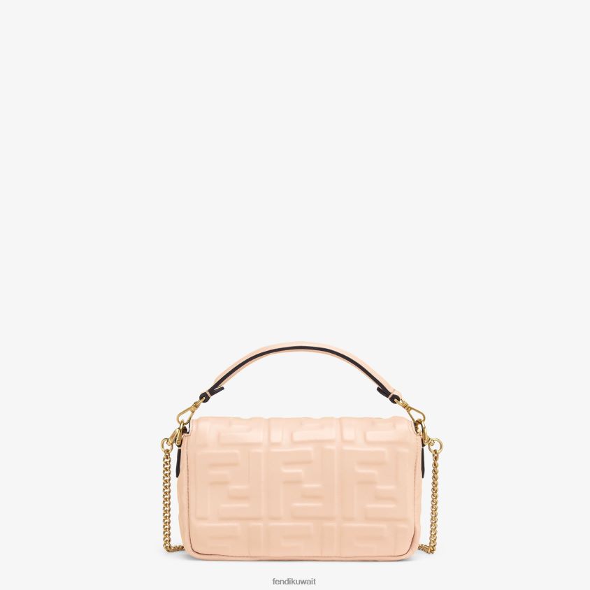 حقيبة باغيت صغيرة أيقونية مصنوعة من جلد نابا الناعم باللون الوردي الفاتح مع شعار ff منقوش ثلاثي الأبعاد. مزين بمشبك ff.