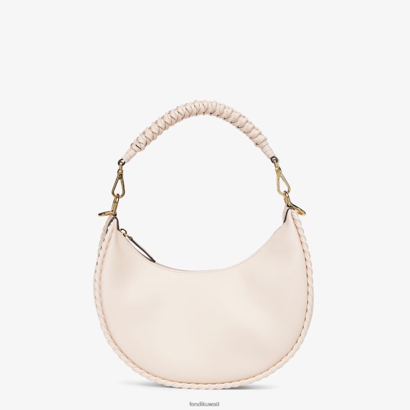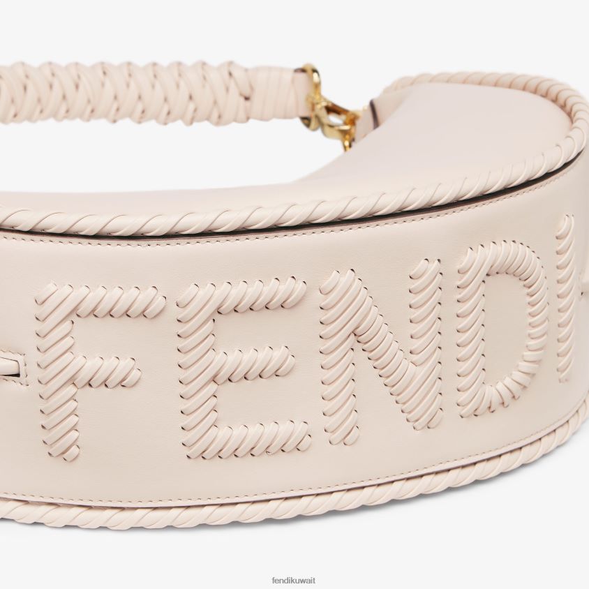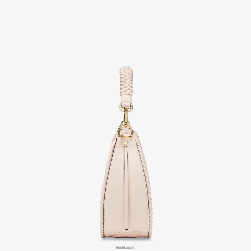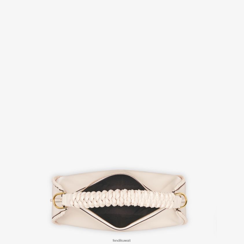 حقيبة هوبو صغيرة مصنوعة من جلد الكاميليا الناعم، ومزينة بمقبض وحواف مضفرة وأحرف فندي مع خيوط جلدية مصنوعة يدويًا.