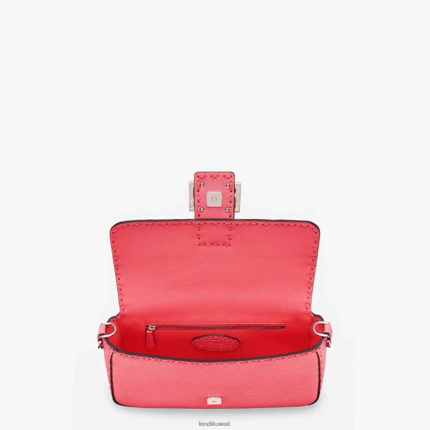 حقيبة باغيت متوسطة الحجم أيقونية مصنوعة من جلد كيويو رومانو باللون الوردي ومزينة يدويًا بخياطة متطابقة. مزين بمشبك ff. تتميز بغطاء أمامي، ومشبك مغناطيسي، وحجرة داخلية بجيب بسحاب، وختم سيليريا من الجلد، وأدوات معدنية مطلية بالبلاديوم.