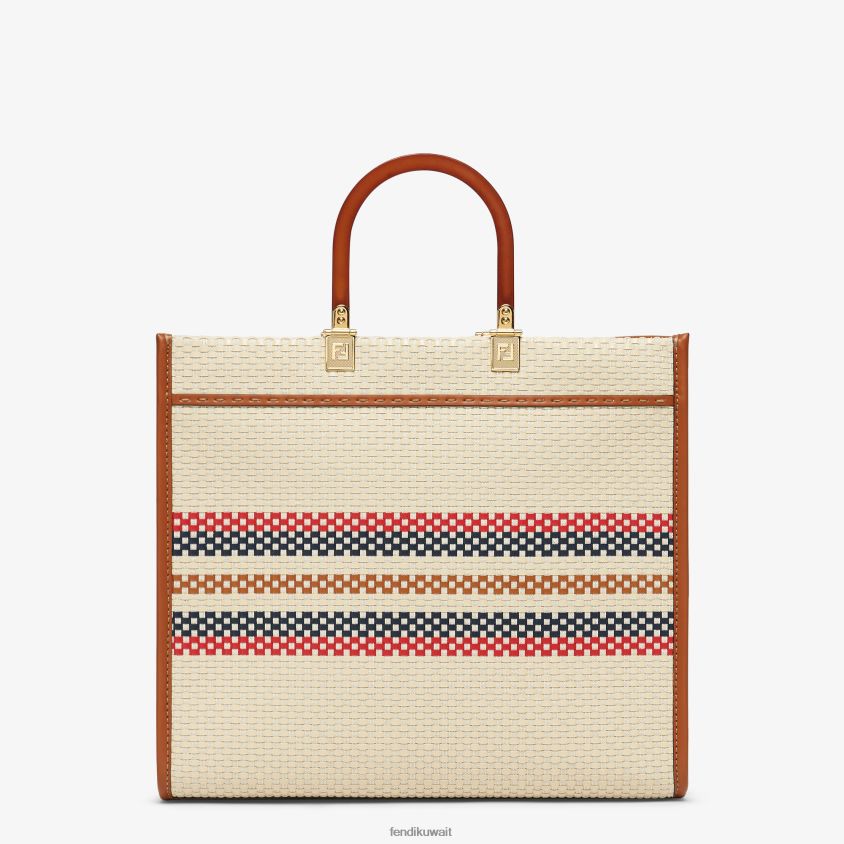 حقيبة تسوق صن شاين متوسطة الحجم مصنوعة من القماش بتأثير مضفر وخطوط بثلاثة ألوان. تتميز بحروف فندي روما بمقابض جلدية بنية ومتينة.