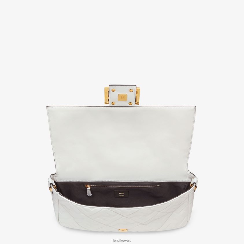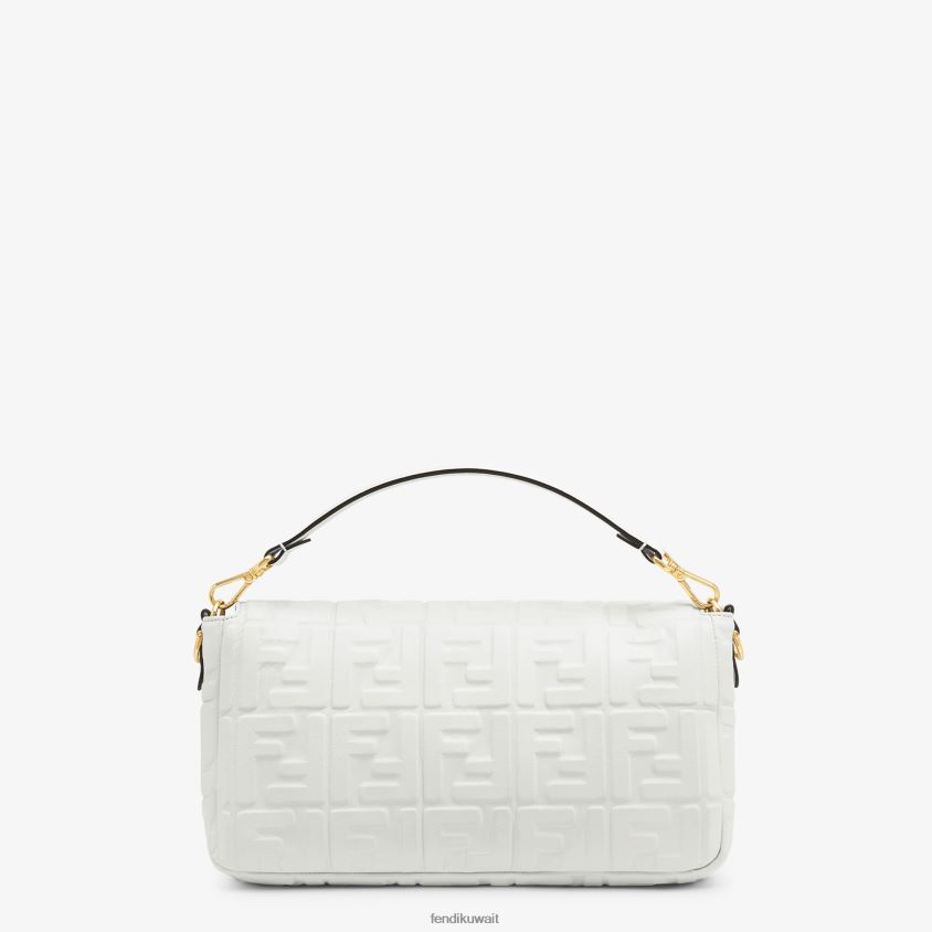 حقيبة باغيت كبيرة أيقونية مصنوعة من جلد نابا الناعم باللون الأبيض مع شعار ff ثلاثي الأبعاد. مزين بمشبك ff.