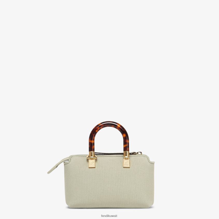 حقيبة باي ذا واي بوسطن الشهيرة مصنوعة من قماش أخضر فاتح مع تطريز فندي روما المرتفع ومقابض زجاجية صلبة بتأثير صدفة السلحفاة. إغلاق بسحاب.