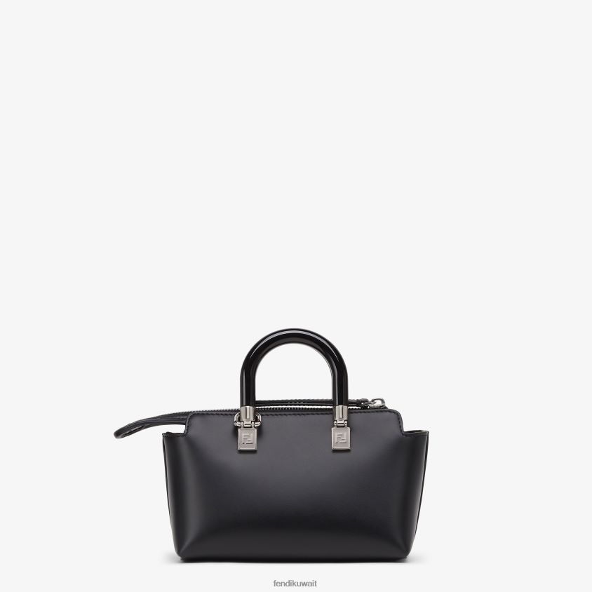 حقيبة صغيرة مميزة من باي ذا واي بوسطن مصنوعة من الجلد الأسود مع حروف فندي روما البيضاء المختومة ومقابض زجاجية صلبة سوداء. إغلاق بسحاب.