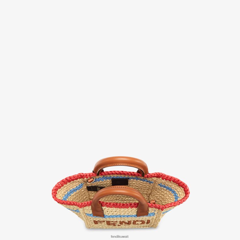 حقيبة صغيرة ناعمة من Sunshine مصنوعة من الرافية ذات الألوان الطبيعية المنسوجة يدويًا مع شريط مزدوج بلونين. تطريز فندي روما باللون البني.