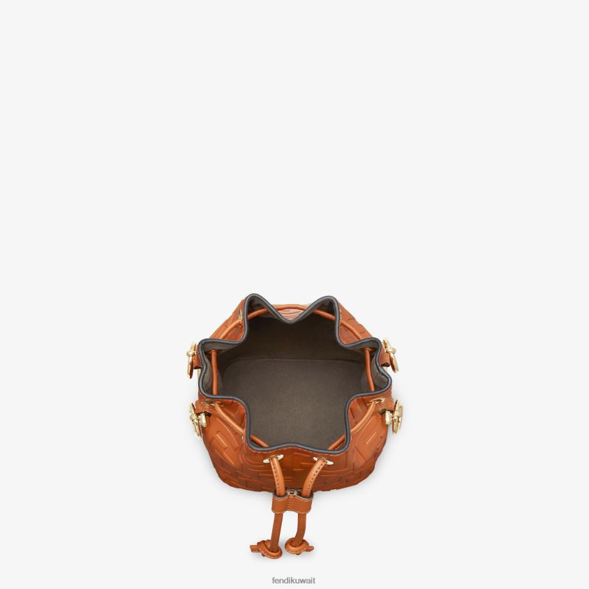 حقيبة دلو مون تريزور صغيرة من الجلد باللون البني مع زخرفة ff منقوشة وملمس ثلاثي الأبعاد.