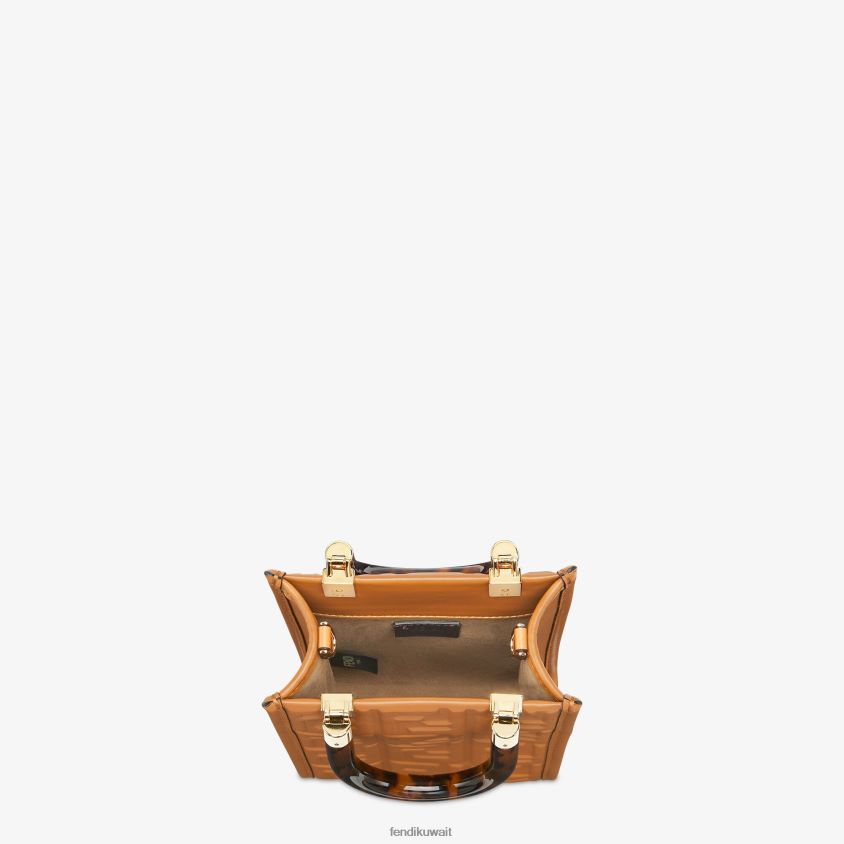 حقيبة تسوق صغيرة "صن شاين" مصنوعة من الجلد البني مع زخرفة ثلاثية الأبعاد ومقابض زجاجية صلبة بتأثير صدفة السلحفاة.