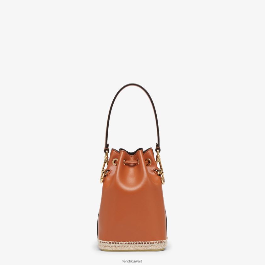 حقيبة دلو مون تريزور صغيرة من الجلد باللون البني مع تطريز فندي روما باللون البني، وقاعدة مصنوعة باستخدام تقنية أحذية الإسبادريل.