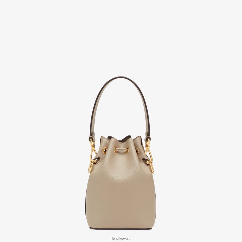 حقيبة دلو صغيرة للإغلاق برباط وزخارف معدنية على شكل شعار فندي. تحتوي الحقيبة على حزامين للكتف قابلين للفصل، أحدهما طويل والآخر قصير، لوضع الحقيبة على الكتف أو على شكل متقاطع. مصنوع من جلد العجل باللون البيج. أدوات معدنية ذهبية.