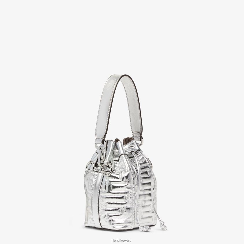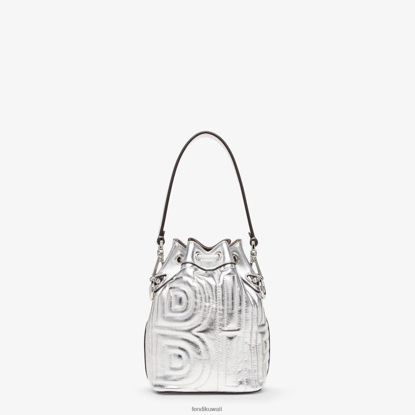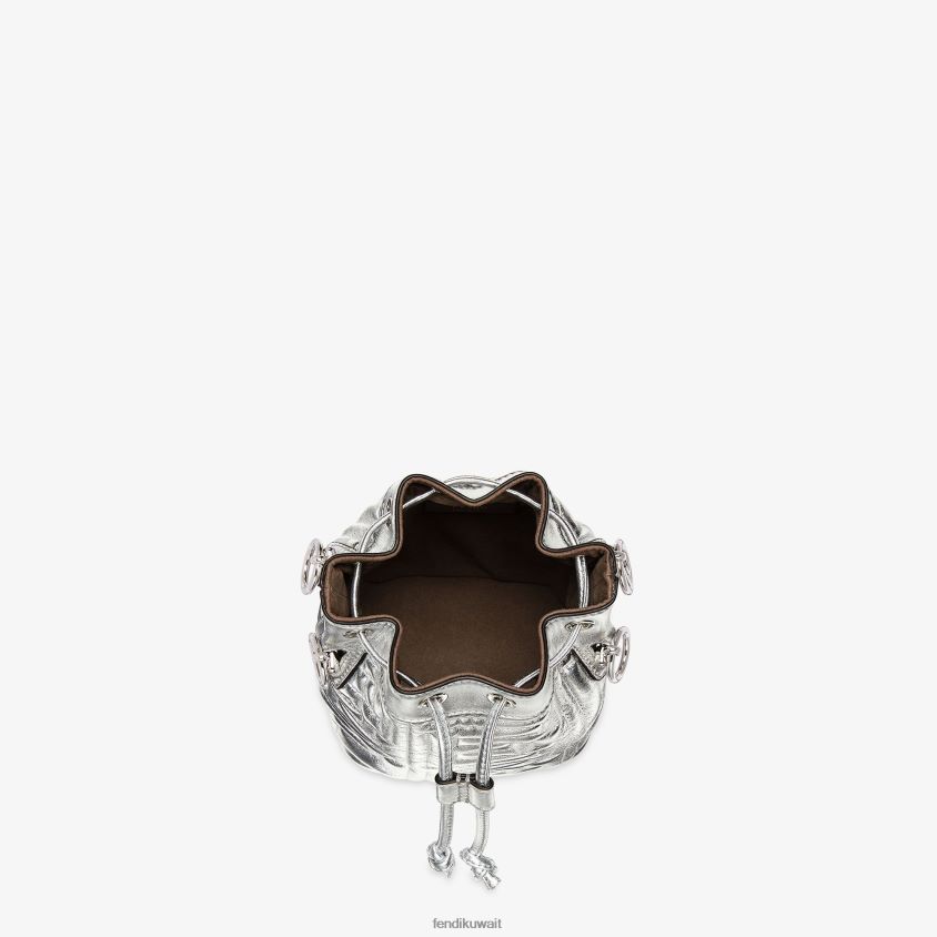 حقيبة دلو مون تريزور صغيرة. جزء من إصدار فندي من مارك جاكوبس المحدود، هذا الطراز مصنوع من جلد فضي اللون مع حروف فندي روما المبطنة والبارزة.