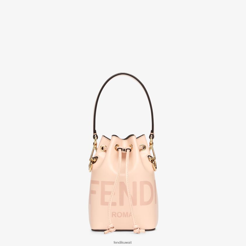 حقيبة دلو مون تريزور صغيرة من الجلد باللون الوردي الفاتح، مع طباعة حروف فندي روما.