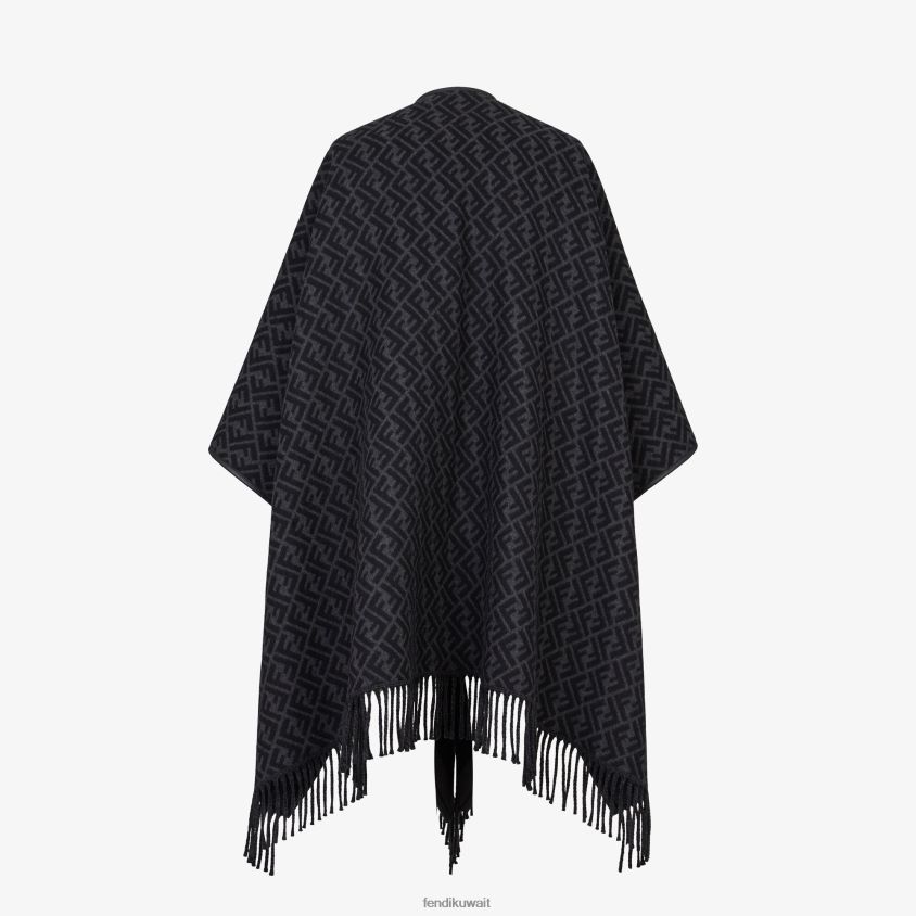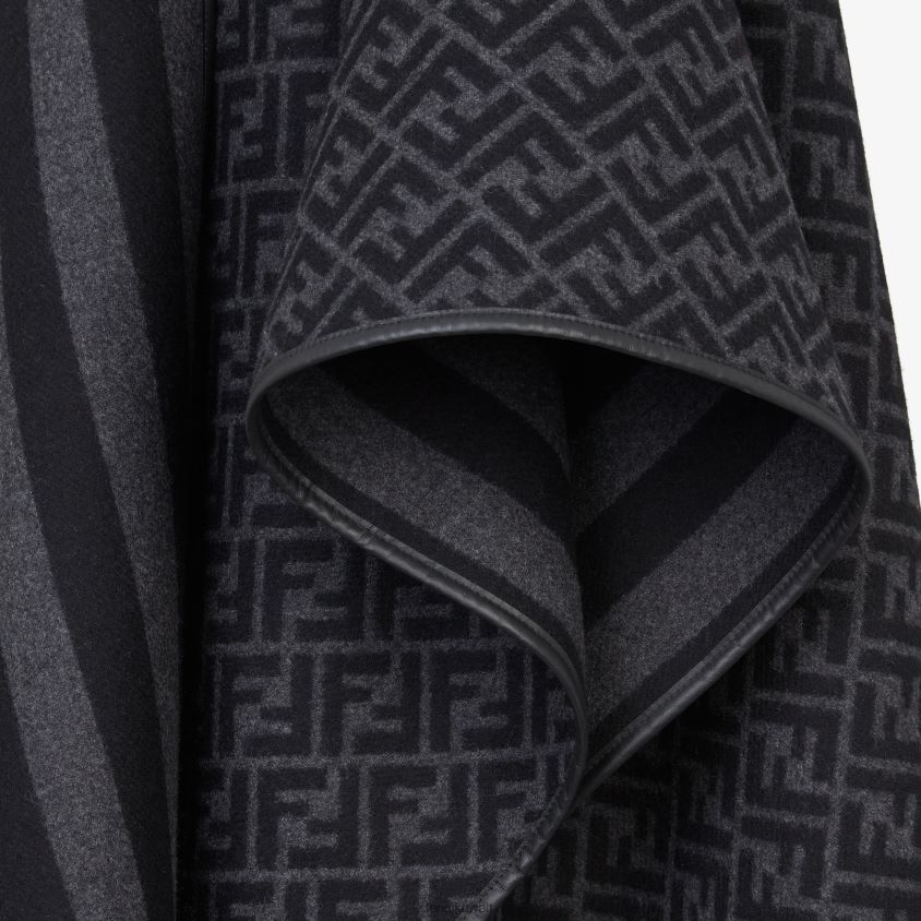 معطف ذو وجهين مع شراشيب على الحاشية. مصنوع من الكشمير والصوف باللونين الأسود والرمادي. تم تشطيب أحد الجانبين بزخرفة ff والآخر بنمط بيكيني. حواف مزخرفة بالجلد الأسود.