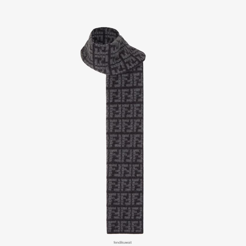 وشاح من الكشمير مستطيل الشكل على جانب واحد مزين بزخارف جاكار ff باللونين الأسود والرمادي الفحمي بالكامل.