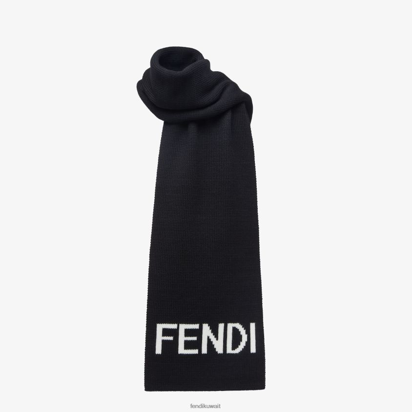 وشاح مستطيل مصنوع من الصوف الأسود. مزين بحروف جاكار فندي باللون الأبيض.