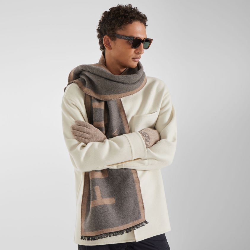 وشاح مستطيل مصنوع من الصوف والحرير. أحد الجانبين يحمل العلامة التجارية ماكرو فندي روما باللونين الرمادي والبيج، بينما الجانب الآخر بلون ثابت.