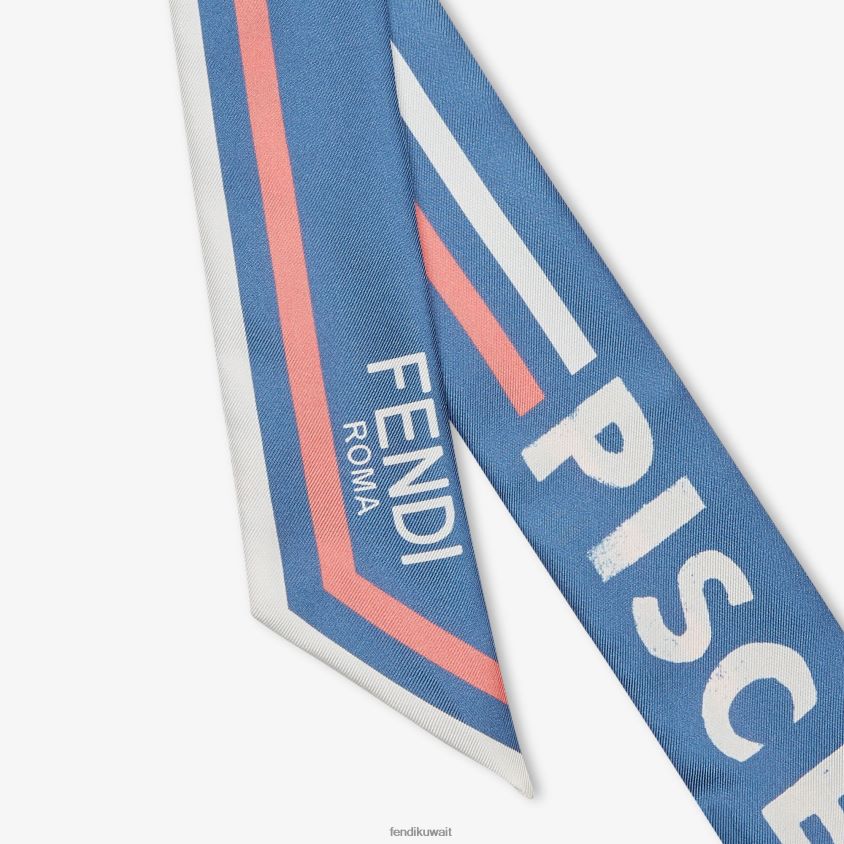 ملفوف على الوجهين. يمكن ارتداؤها حول الرقبة، أو عقدها عند المعصم، أو استخدامها لتزيين حقيبة بلمسة من الألوان. مصنوع من الحرير الأزرق مع حروف pesci/pisces مطبوعة باللونين الأبيض والوردي. مع لمسة نهائية بتفاصيل مخططة بنفس الألوان.