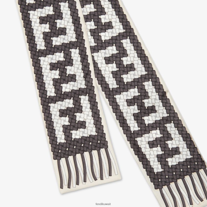 ملفوف على الوجهين بنهاية مستقيمة. يمكن ارتداؤها حول الرقبة، أو عقدها عند المعصم، أو استخدامها لتزيين حقيبة بلمسة من الألوان. مصنوع من الحرير، مع تأثير ترومب لويل وزخارف متشابكة مطبوعة بالكامل باللون الأسود.