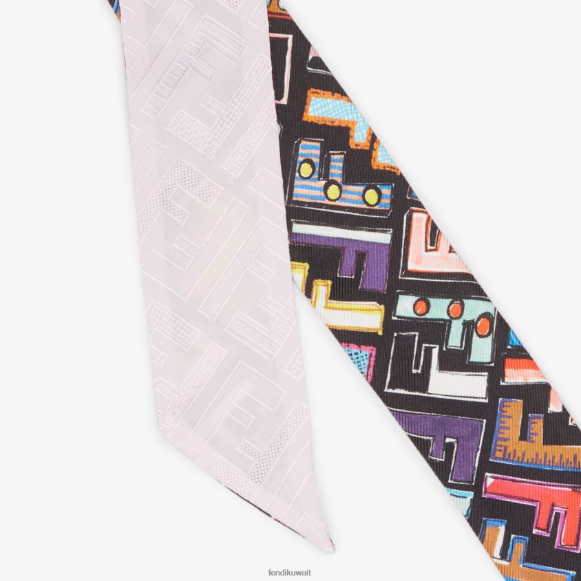 ملفوف على الوجهين. يمكن ارتداؤه حول الرقبة أو كحزام أو ربطه على المعصم أو لإضافة لمسة من الألوان إلى الحقائب. مصنوعة من نسيج قطني طويل من الحرير. تتم طباعة شعار ff الأيقوني على جانب واحد، ويتم تفسيره بأنماط متعددة الألوان مرسومة يدويًا على خلفية سوداء. الجانب الوردي مزين بأعمال الجاكار ff.