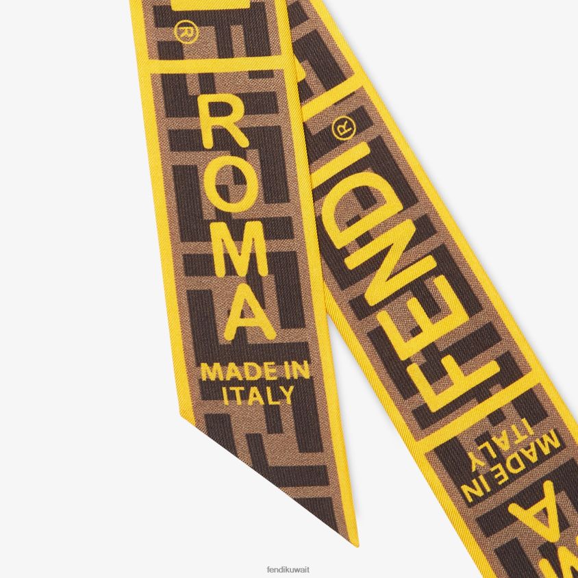 ملفوف على الوجهين. يمكن ارتداؤها حول الرقبة، أو عقدها عند المعصم، أو استخدامها لتزيين حقيبة بلمسة من الألوان. مصنوع من الحرير مع حروف فندي روما باللون الأصفر مطبوعة على خلفية باللون البني والتبغ.