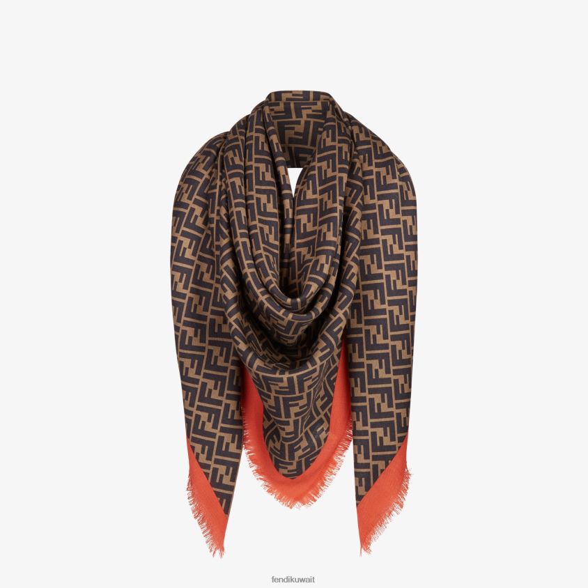 شال مربع كبير مصنوع من مزيج رائع من الكشمير والصوف والحرير، مع نمط ff الأيقوني المطبوع بالكامل بظلال من اللون البني. مزين بحدود حمراء متباينة. حواف مهدبة يدويًا.