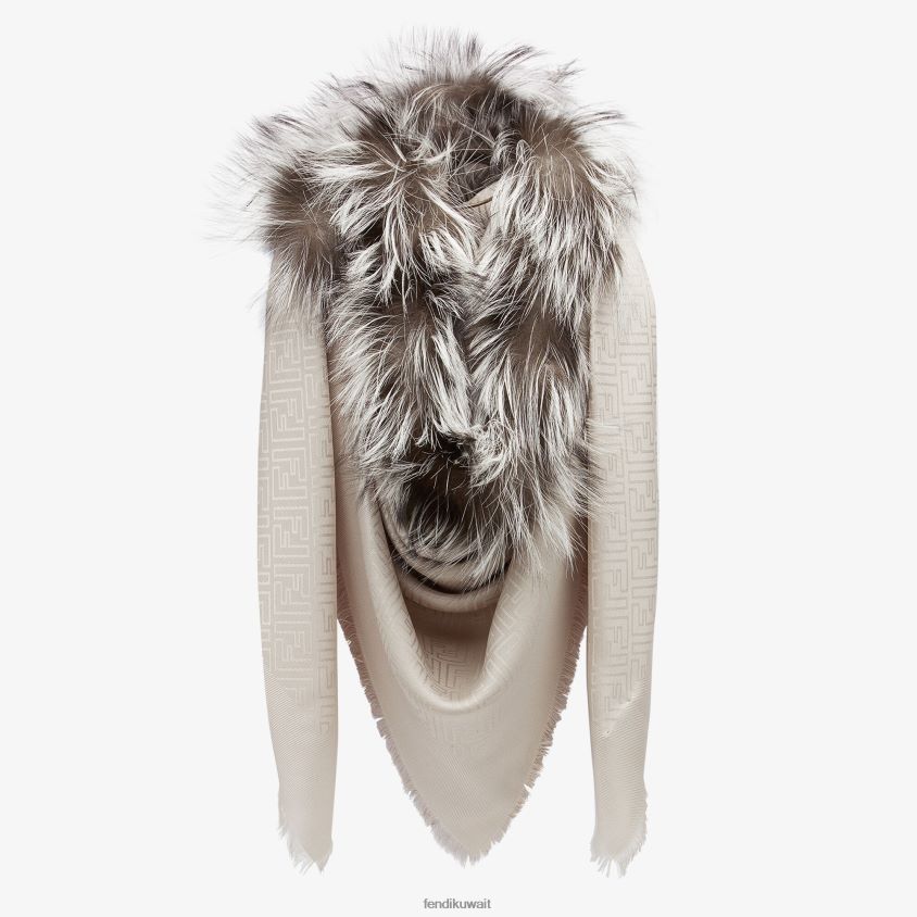 شال مزود بحشوة من الفرو وحواف متوترة يدويًا. مصنوع من مزيج ناعم من الحرير والصوف البيج. يُعيد عمل الجاكار إنتاج شعار ff بلون واحد. تُغلف حشوة فرو الثعلب الناعم الرقبة عند ارتدائها.