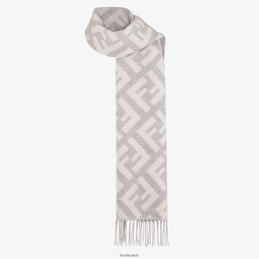 وشاح طويل انتهى مع التهديب. مصنوع من الصوف الرمادي الفاتح والكشمير. يُعيد نسيج الجاكار خلق درجة اللون على شكل ff.