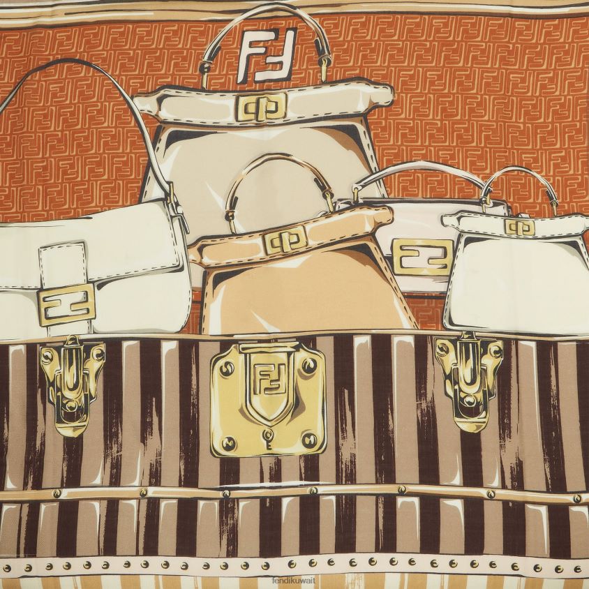 شال مربع كبير مصنوع من مزيج من الصوف الناعم والحرير. تلتقط طبعة حقائب فندي الشهيرة بعض العناصر الأكثر شهرة للعلامة التجارية. خمس حقائب، من الرغيف الفرنسي والبيكين، محاطة بصندوق مستوحى من الطراز العتيق مزين بنمط شريطي من البيكين. تم تزيين الخلفية بدرجة لونية مع شعار ff الشهير. حواف متباينة مع تفاصيل مخططة وشعار ff. لمسة نهائية بحواشٍ مهترئة يدويًا.