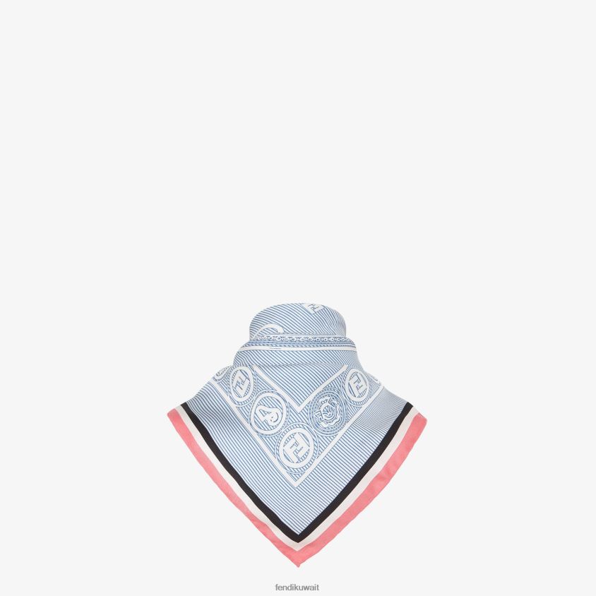 وشاح مربع مصنوع من نسيج قطني طويل مخطط باللونين الأزرق والأبيض، مع طباعة رسم تنجيم فندي في كل مكان. مؤطرة بحدود مخططة متباينة.