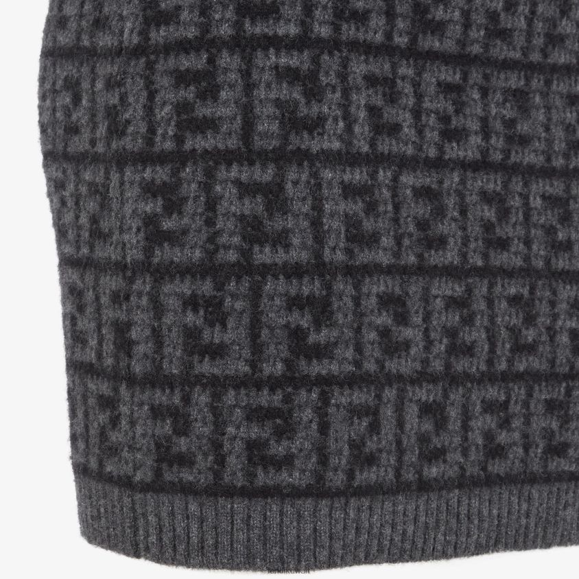 تنورة قصيرة جاهزة. مصنوع من الكشمير مع زخارف كروشيه بالكامل باللونين الرمادي والأسود. مزخرف بحافة مضلعة.
