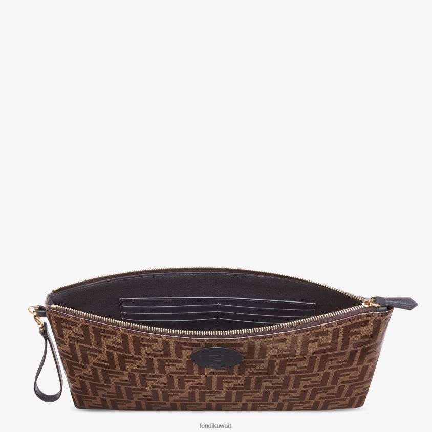 حقيبة كبيرة ff مع مقبض سوار قابل للإزالة. إبزيم الرمز البريدي. مصنوع من قماش مصقول باللون البني مع تصميم جاكار ff. تم تشطيبه بتفاصيل من الجلد الأسود. أدوات معدنية مطلية بالذهب.