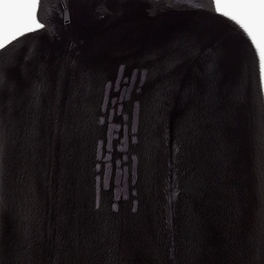 سترة ذات وجهين مع غطاء محرك السيارة. جيوب اثنين. إبزيم الرمز البريدي. مصنوعة من المنك الأسود. مزين بزخارف فندي المطرية باللون الرمادي على الصدر.