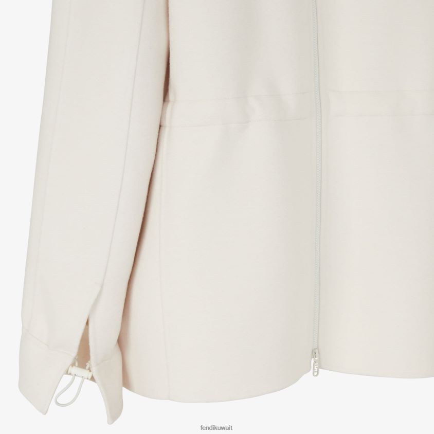 جاكيت بياقة قميص وخصر برباط داخلي قابل للتعديل. أكمام طويلة بقصة منخفضة مع أساور برباط. إغلاق مخفي. مصنوع من الصوف الأبيض مزدوج الوجه مع بطانة متطابقة بنمط ff.