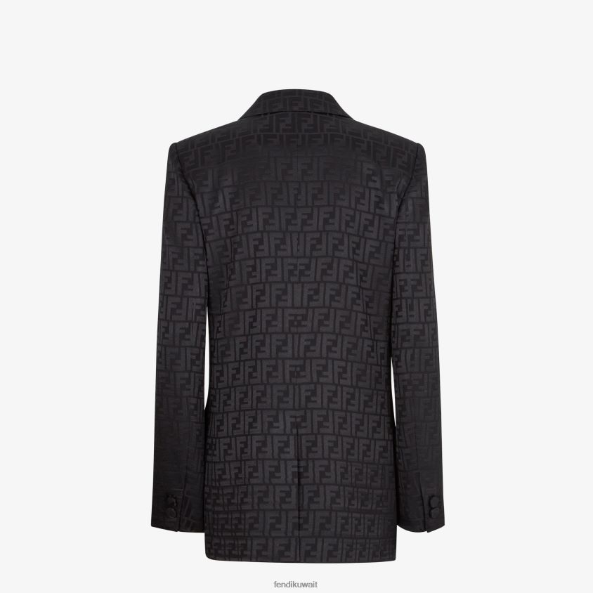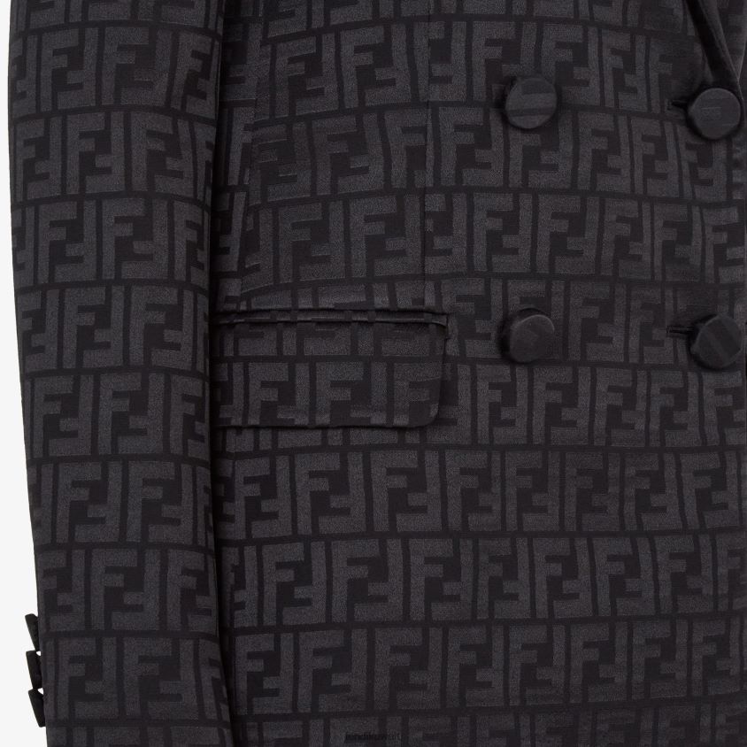 سترة مزدوجة الصدر بقصة مستقيمة مع طية صدر السترة. جيوب بغطاء قلاب وفتحة تهوية في منتصف الظهر. مصنوع من كريب الحرير الأسود مع زخرفة جاكار ff بالكامل. أزرار مغطاة متطابقة.