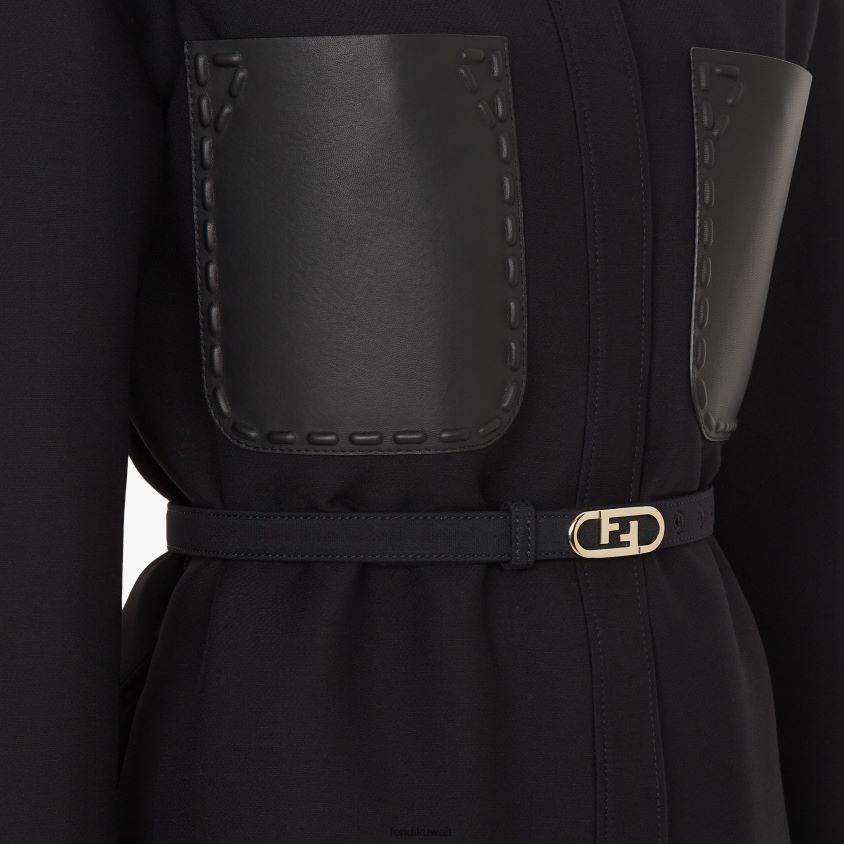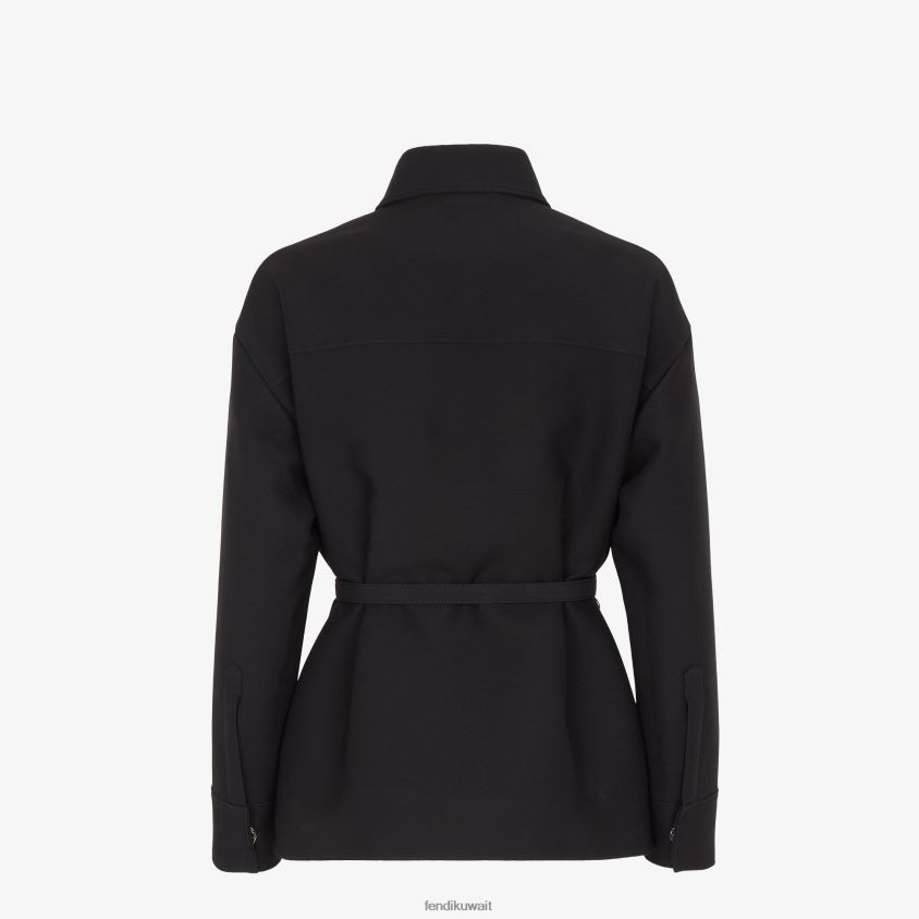 سترة أحادية الصدر مع ياقة قميص وأكمام منخفضة القطع. حزام مطابق بإبزيم معدني من فندي أولوك. جيوب رقعة كبيرة الحجم على الصدر. مصنوعة من الصوف والحرير الأسود. تم تشطيب الجيوب الجلدية بتطريز سيليريا بارز.