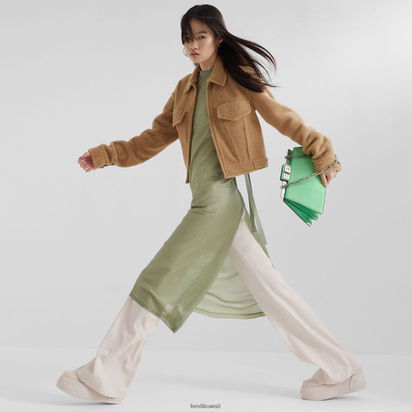 سترة قصيرة مع ياقة القميص وجيوب على الصدر. أكمام طويلة منسدلة قليلاً. إغلاق بسحاب أمامي مع سحاب فندي أولوك. مصنوع من جلد الغنم البيج فائق النعومة مع ملمس ناعم وخفيف الوزن.