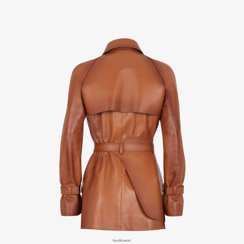 سترة خندق بقصة مستقيمة مع سحاب مغطى وأزرار كبس. يتميز بياقة القميص وأشرطة قابلة للتعديل عند الأساور. مصنوع من جلد أسمر مع تأثير مظلل مميز. حزام قابل للإزالة مع بيبلوم جانبي، وجيب بحاشية وحلقة معدنية. إبزيم فندي أولوك معدني بلمسة نهائية ذهبية.