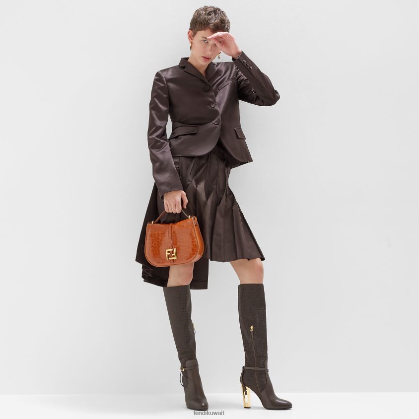 سترة قصيرة بصدر واحد مع ياقة صغيرة وطية صدر، وأكمام منفصلة، وفتحة تهوية في منتصف الظهر. جيب على الصدر وجيوب بغطاء قلاب في الأمام. مغلق بثلاثة أزرار مغطاة. مصنوع من الحرير البني والقطن دوقة الساتان مع نسيج مغسول. تم تشطيبه بحروف صغيرة "fendi roma made in italy" مطرزة بدرجة مطابقة على الجزء الخلفي من الكم الأيسر.