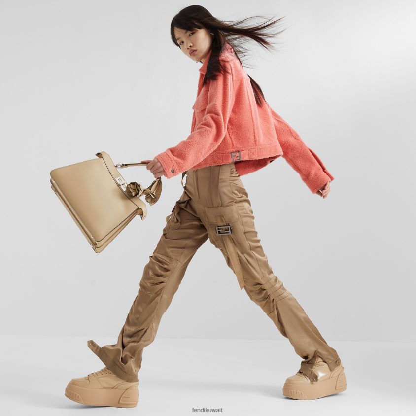 سترة قصيرة مع ياقة القميص وجيوب على الصدر. أكمام طويلة منسدلة قليلاً. إغلاق بسحاب أمامي مع سحاب فندي أولوك. مصنوع من جلد الغنم الوردي العميق فائق النعومة مع ملمس ناعم وخفيف الوزن.