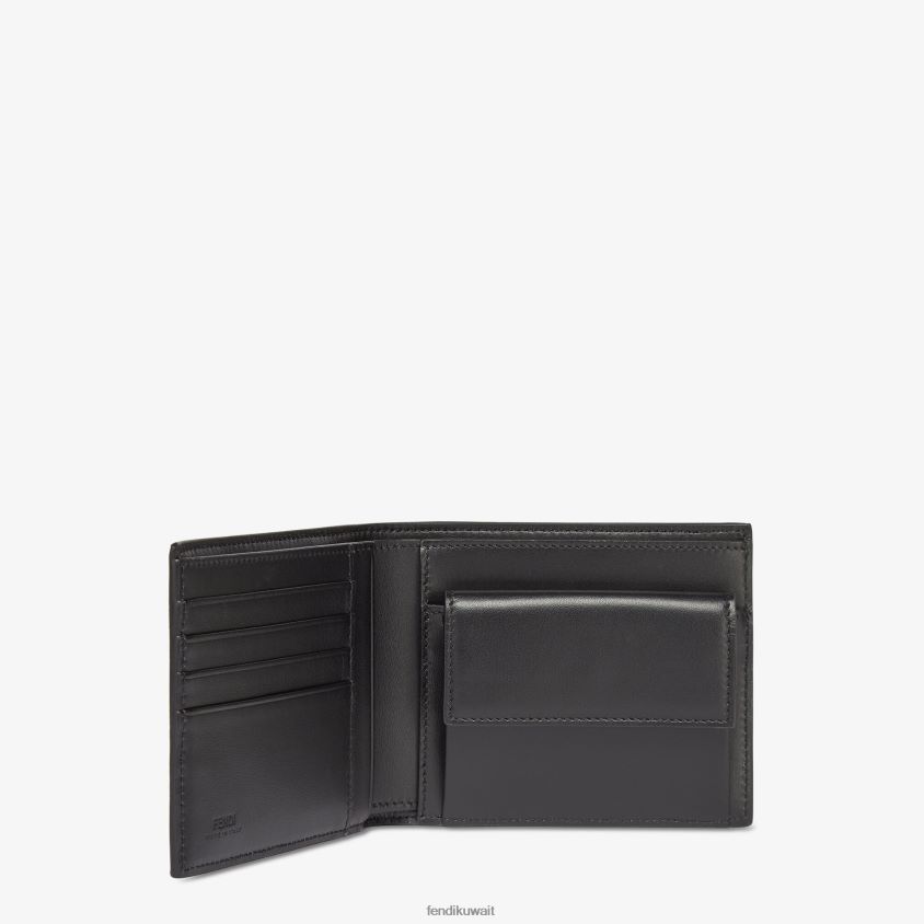 تتميز المحفظة ثنائية الطي بأربع فتحات للبطاقات، وجيب للفواتير، وحجرة عملية للعملات المعدنية تُغلق بكبسة. مصنوع من جلد أسود محبب بالكامل. حروف فندي روما وأدوات معدنية بلمسة نهائية من الروثينيوم باللون الأسود للغاية.