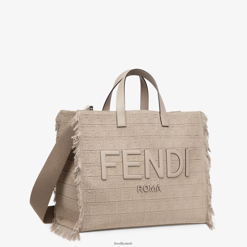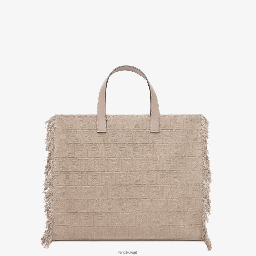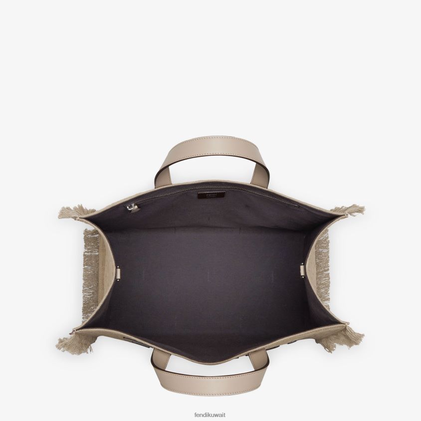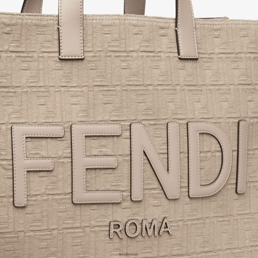 حقيبة تسوق كبيرة مصنوعة من قماش الجاكار باللون البيج، مع نقش FF وحواف مهدبة. مزين بحروف فندي روما من الجلد باللون البيج.
