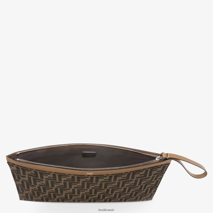 حقيبة مسطحة كبيرة بسحاب. مصنوع من قماش الجاكار باللون البني والتبغ. حروف فندي روما فضية اللون على جلد بيج ومزينة بمقبض السوار. أدوات معدنية مطلية بالبلاديوم.
