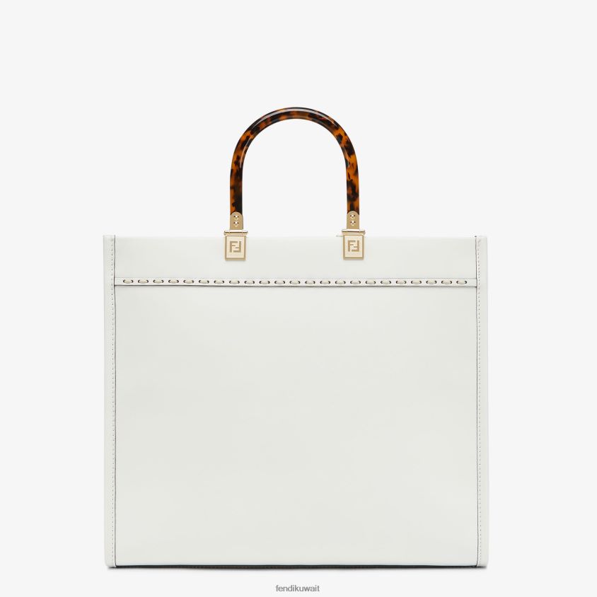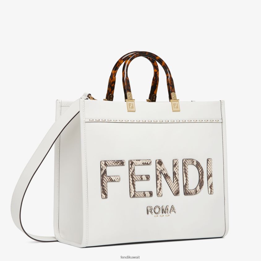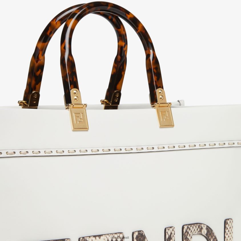 حقيبة تسوق متوسطة الحجم مصنوعة من الجلد الأبيض مع حروف فندي روما في شكل إيلاف بطبعة جلد الثعبان ومقابض زجاجية صلبة بتأثير صدفة السلحفاة.