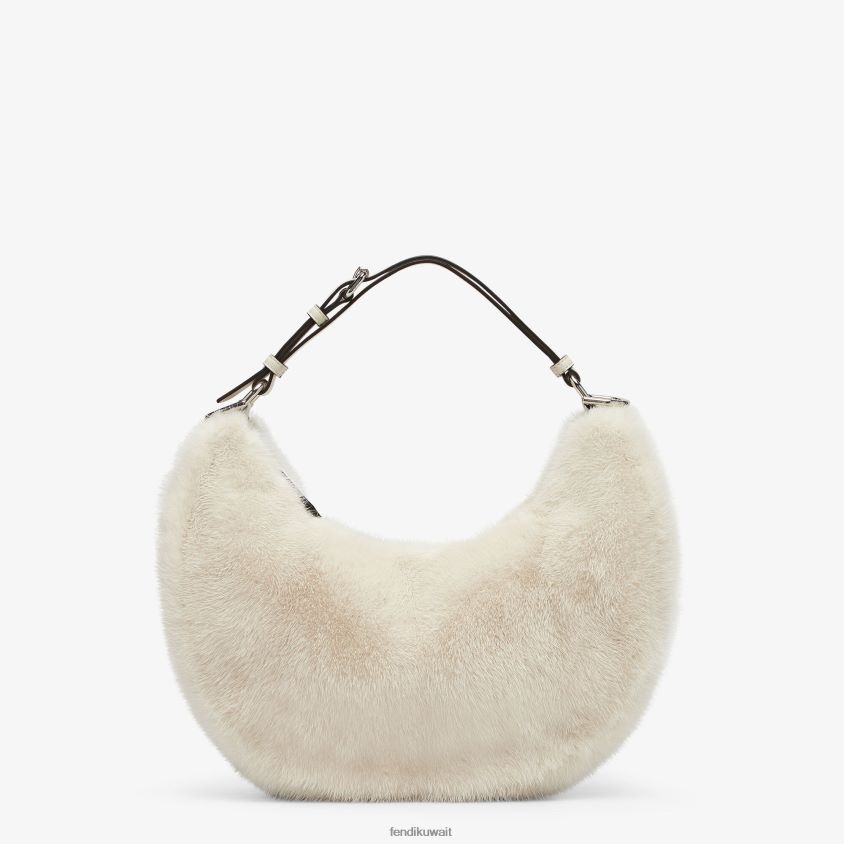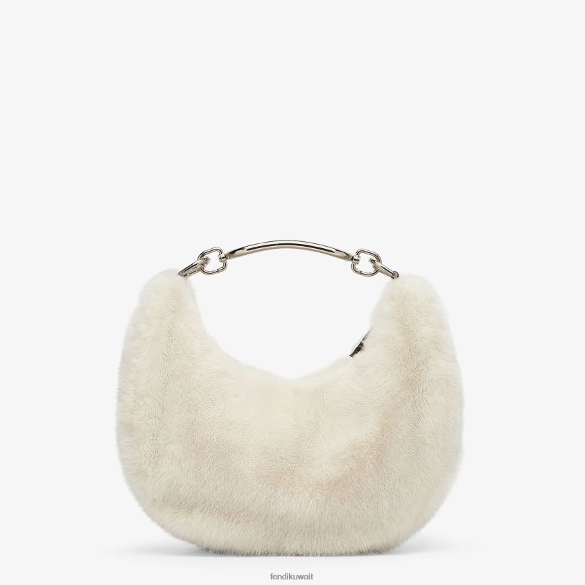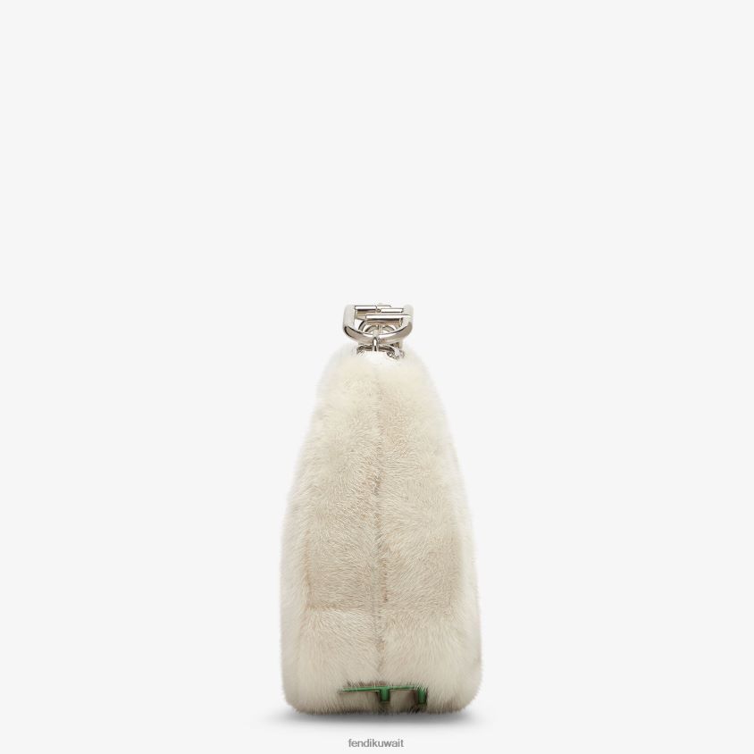 حقيبة هوبو صغيرة مصنوعة من فرو المنك الناعم باللون الأبيض الفاتح، ومزينة بالمعدن الأخضر وأحرف فندي المصنوعة من زجاج شبكي والتي يمكن رؤيتها عند ارتداء الحقيبة تحت الذراع.
