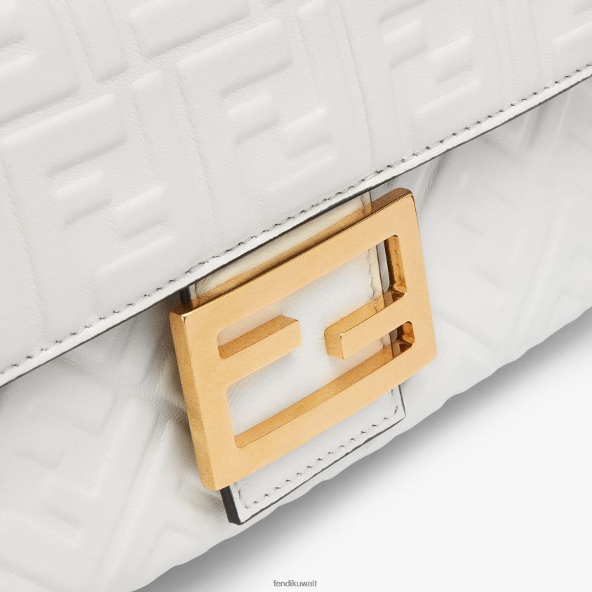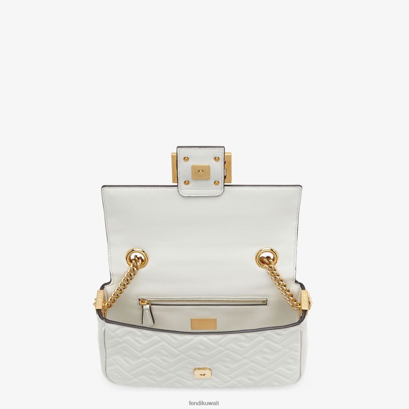 حقيبة باغيت متوسطة الحجم مع سلسلة، مصنوعة من جلد نابا الناعم باللون الأبيض مع زخرفة ثلاثية الأبعاد. مزين بإبزيم على شكل حرف FF.