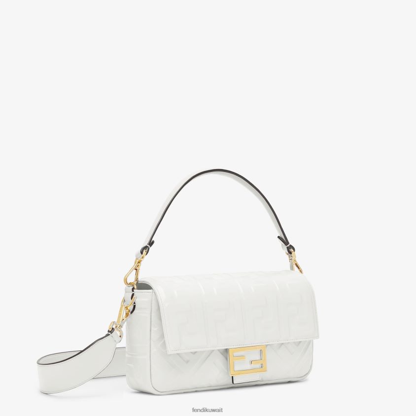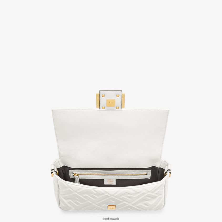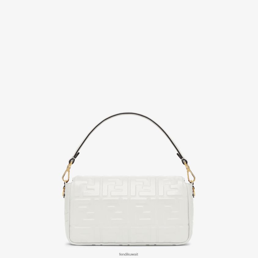 حقيبة باغيت متوسطة الحجم أيقونية مصنوعة من جلد نابا الناعم باللون الأبيض مع شعار FF ثلاثي الأبعاد. مزينة بإبزيم على شكل حرف ff.