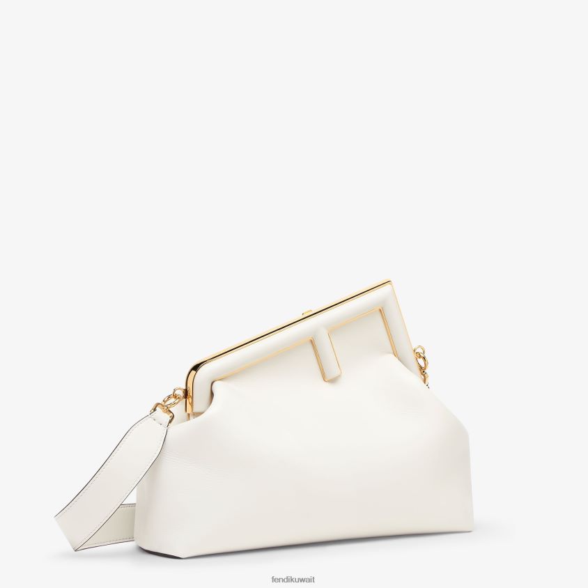 حقيبة فندي الأولى متوسطة الحجم مصنوعة من جلد نابا الناعم باللون الأبيض مع مشبك معدني كبير الحجم مثبت على جلد نابا.